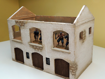 I have finished my first purpose built structure for Blood & Plunder, a Spanish style warehouse. The building features a removable roof and doors. The pan tile roof is made from a non-slip mat, which I will do a tutorial on shortly.
